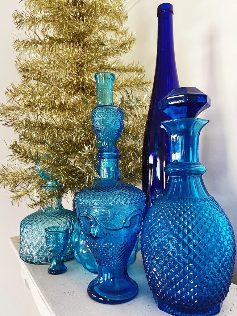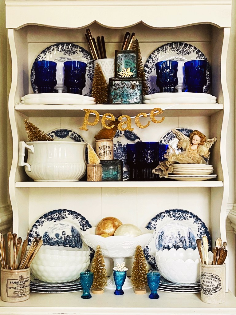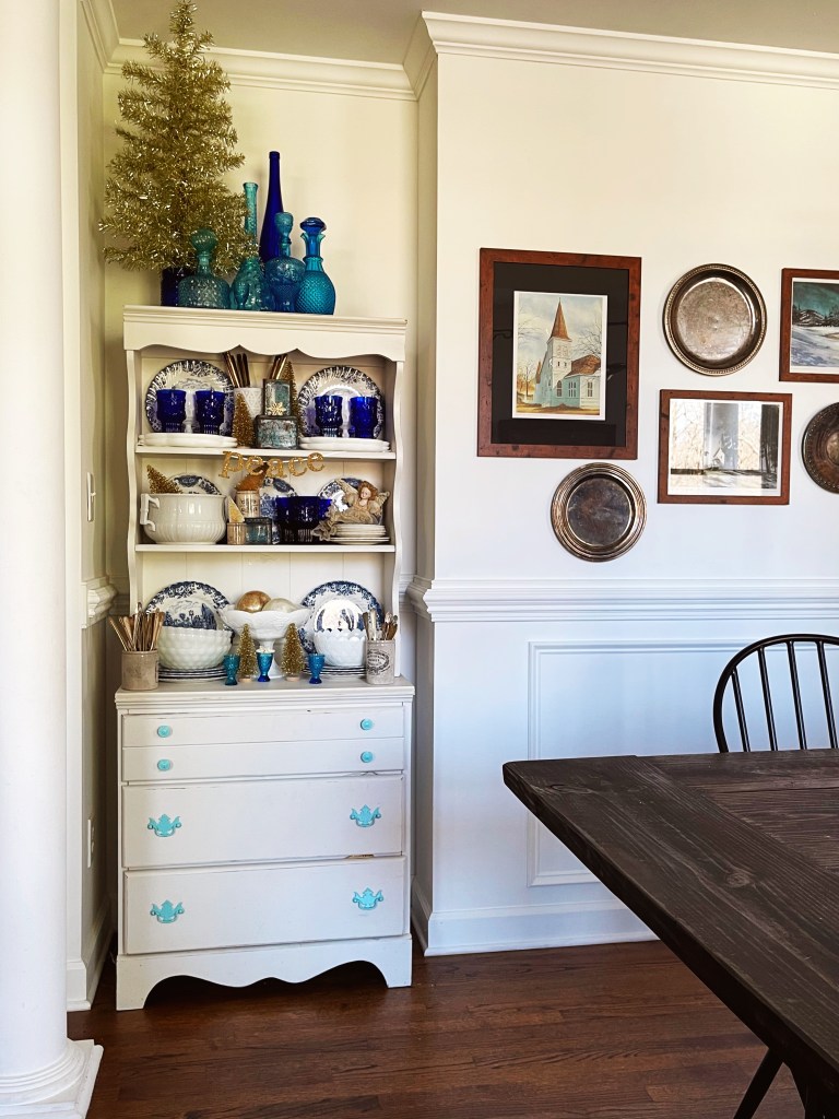This hutch belonged to my Mamaw Pearl and she is the person partially responsible for my love of vintage glassware; she gave me the cobalt blue lanterns. The angel here was hers and sat on top of the tree every year, I treasure it.
