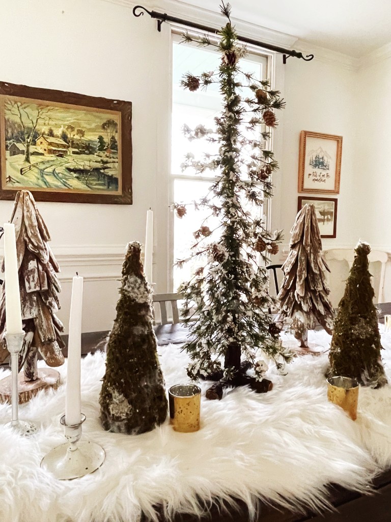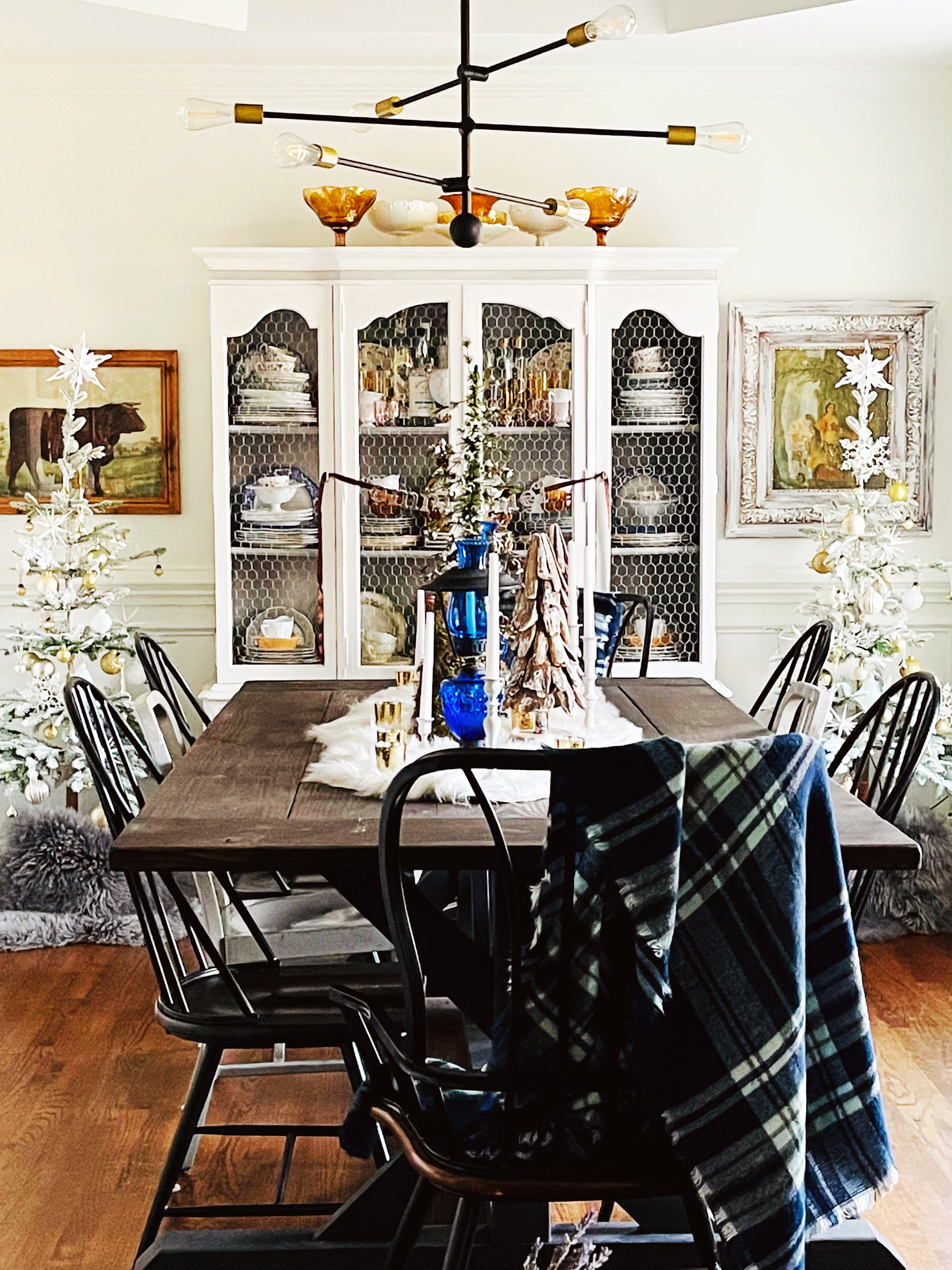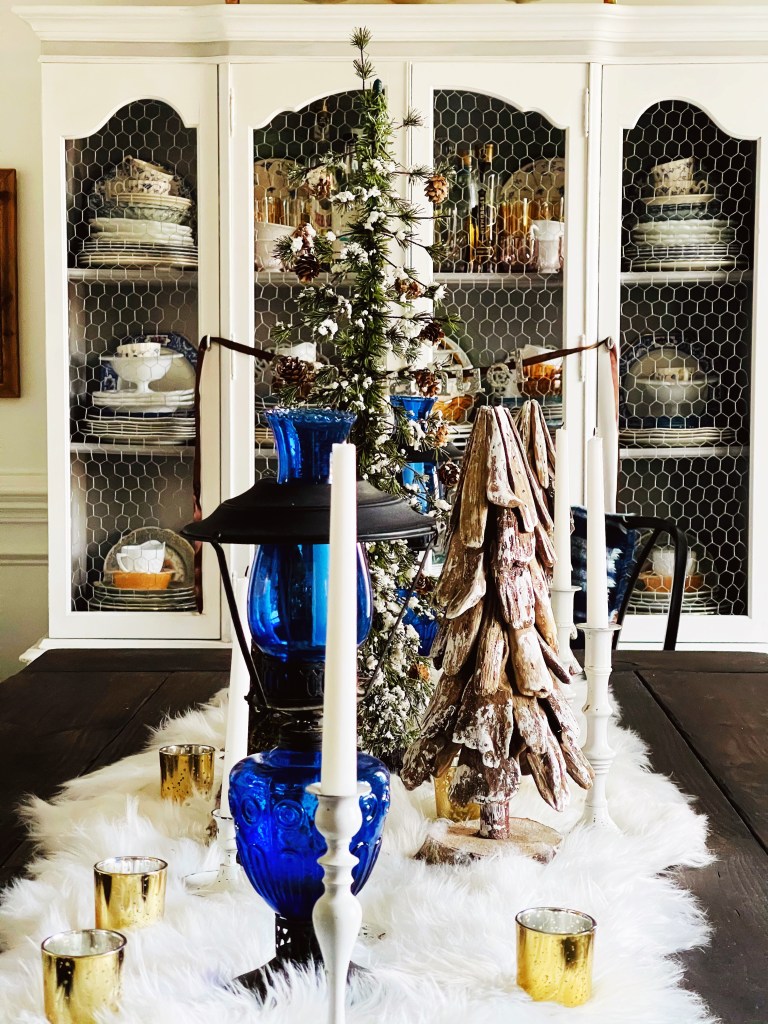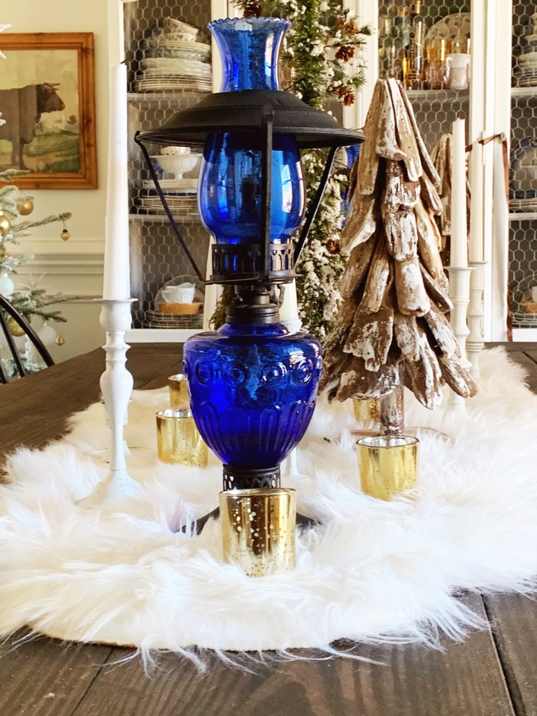 I dressed the table with a fur rug in snowy white and added my cobalt blue vintage lanterns, gold mercury glass, candles and trees in varied heights. And my favorite vintage find this year is the paint by number from 1963- signed and dated on the back.