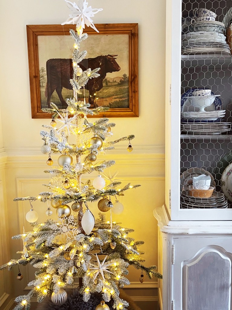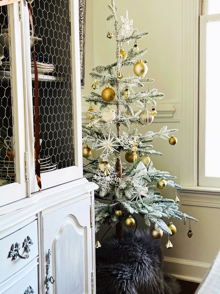I love sparse Christmas trees and the space on either end of the hutch was very limited so I choose the 4 foot flocked Balsam Fir from Balsam Hill. They fit perfectly- I put them on a box to give them a bit of height and decorated them with baubles in shades of white and gold.