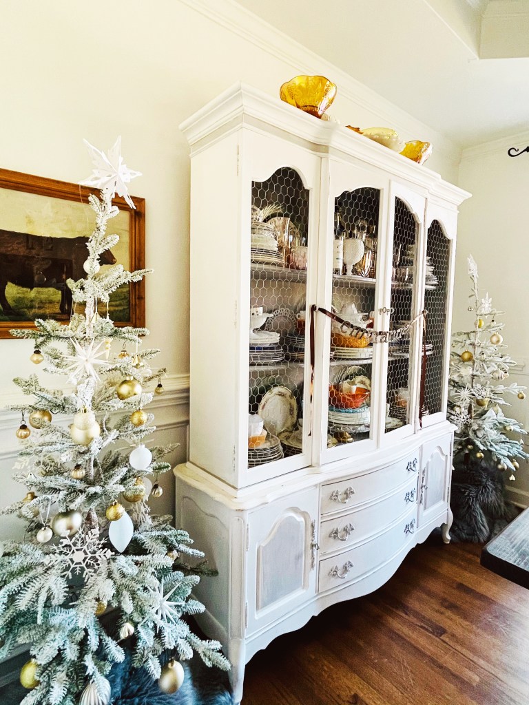 I wanted two Christmas trees flanking my French Provincal hutch. It was a Craigslist find several years ago and holds my collection of vintage china. I took the dated glass out and replaced it with chicken wire